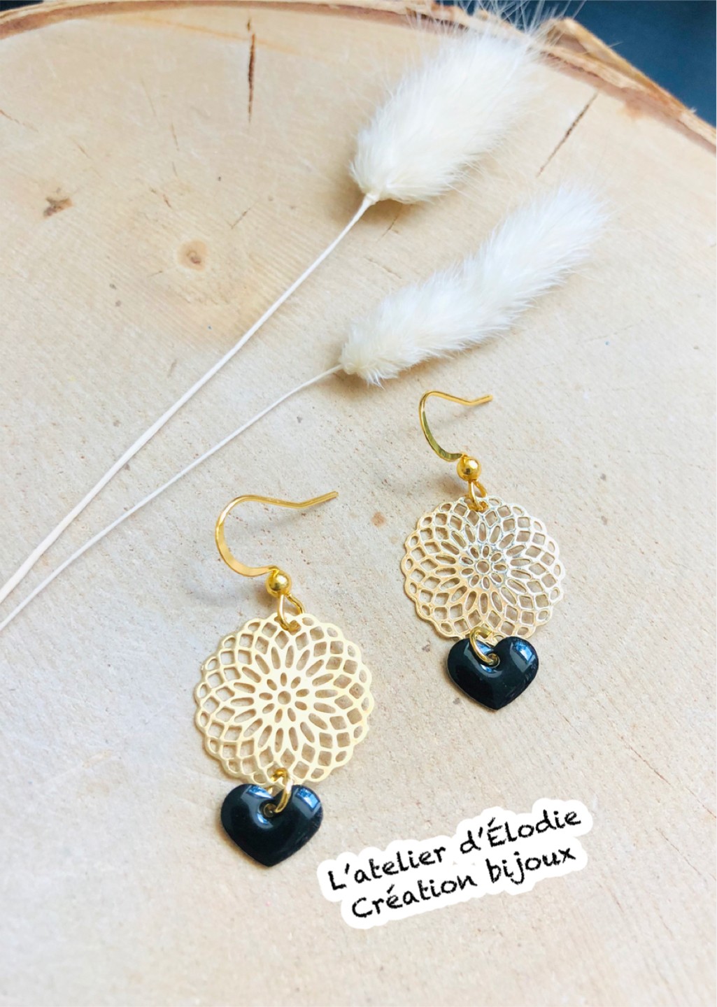 rosace dorée, montée sur crochets d'oreille, cœur émaillé double face
