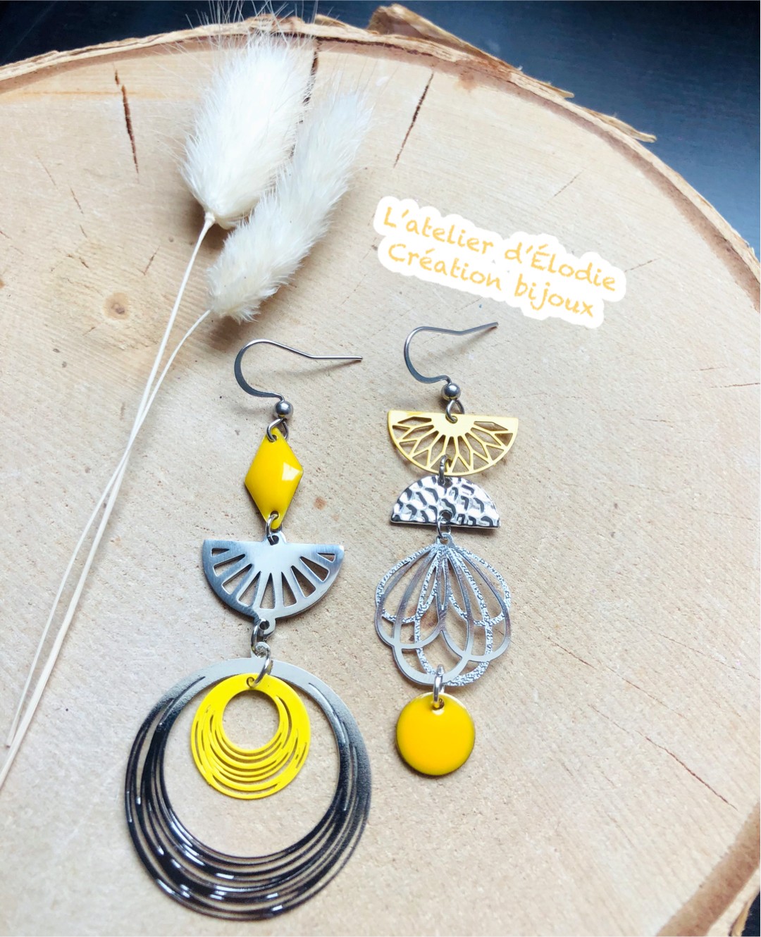 montées sur crochets d'oreille - breloques argentées et émaillées jaunes