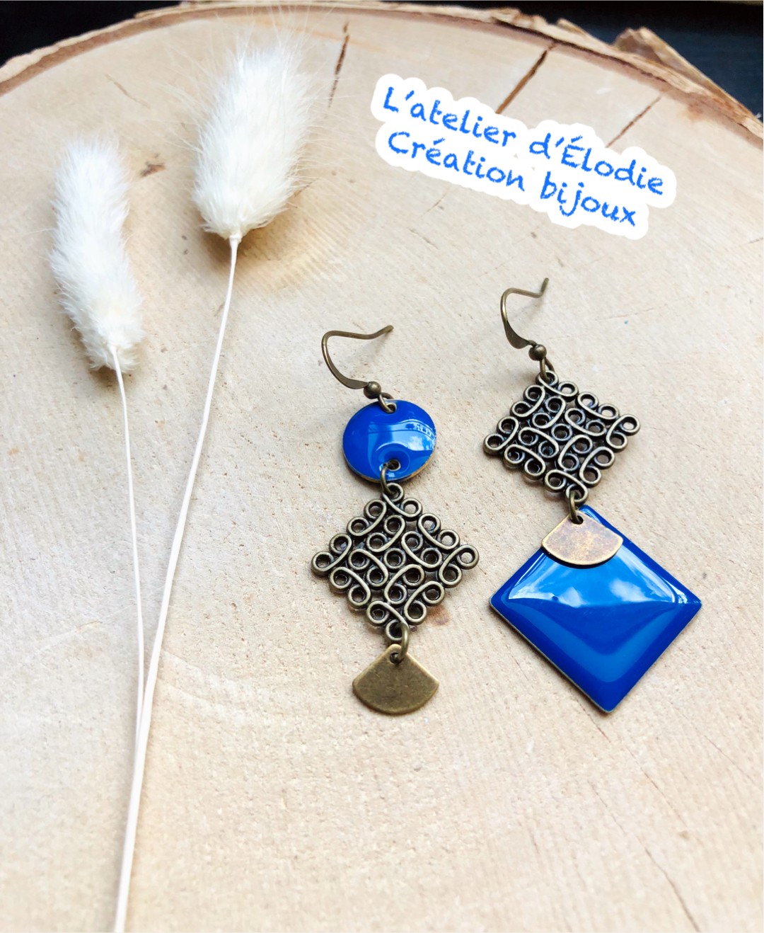ton bronze, breloques colorées émaillées bleu électrique