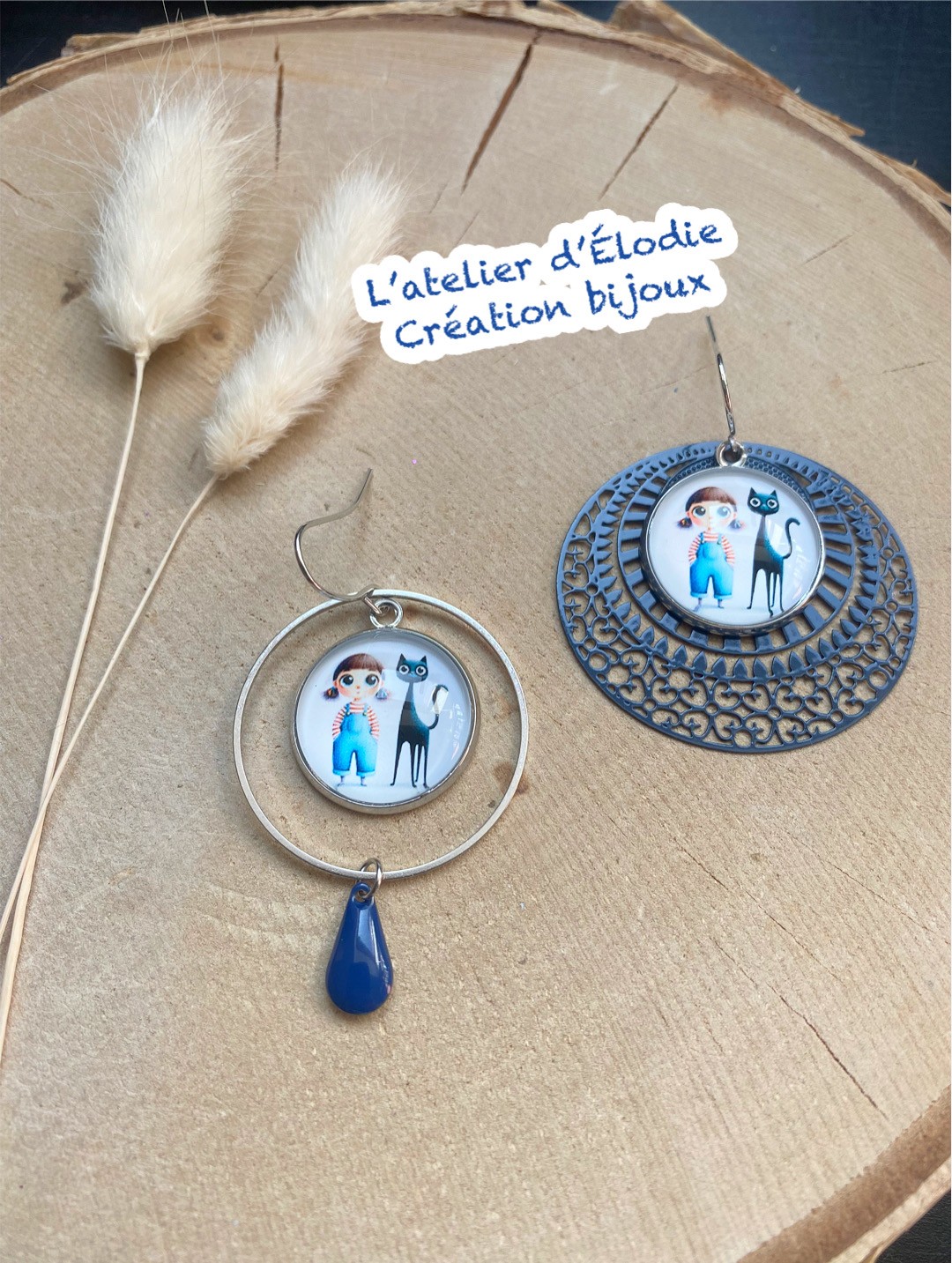 ton argenté - montées sur crochets d'oreille - anneau fermé 30mm - illustrations sous verre 18mm- breloques colorées et émaillées