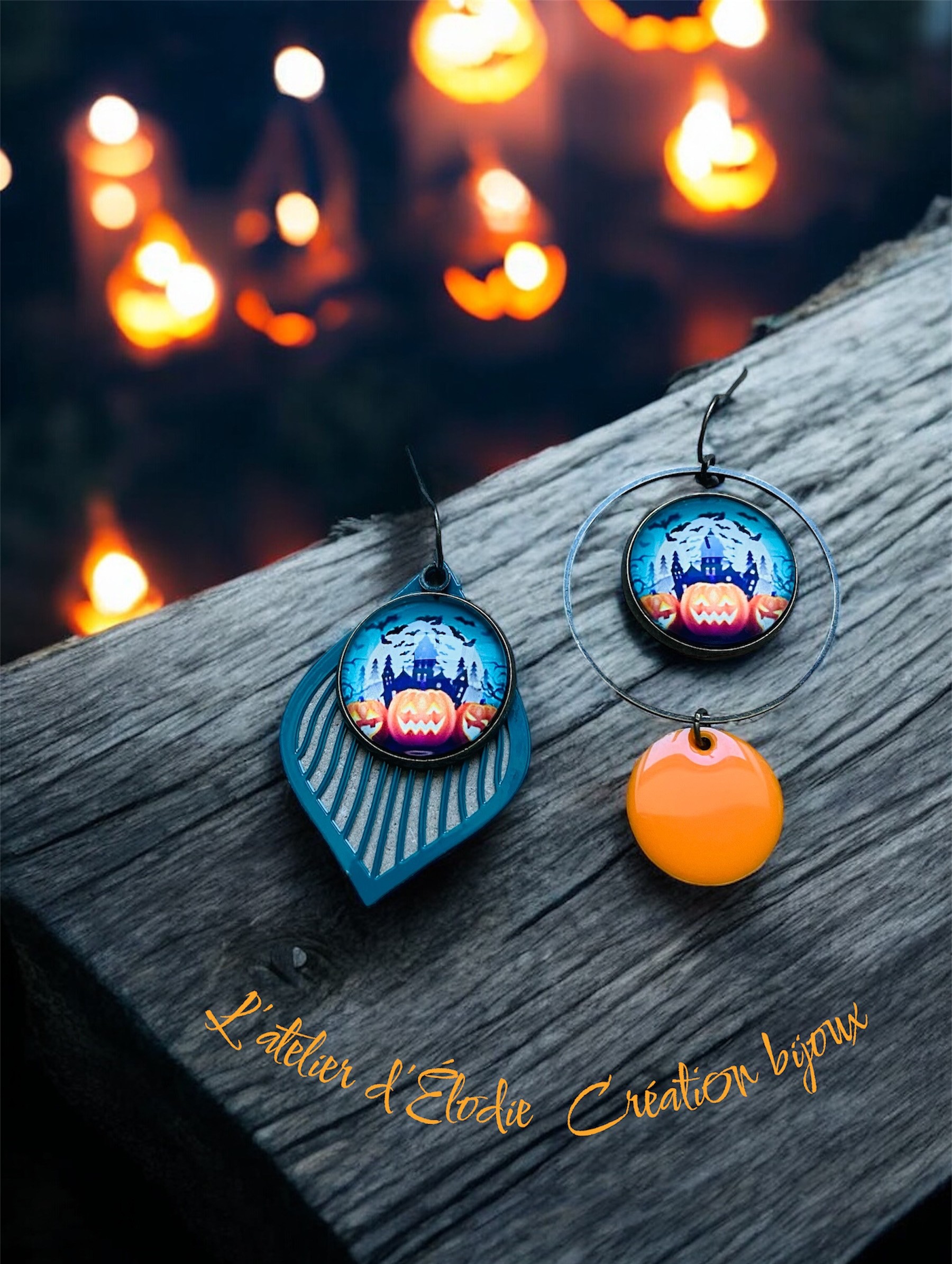 ton bronze - montées sur crochets d'oreille - anneau fermé 30mm - illustrations sous verre 18mm- breloques colorées et émaillées