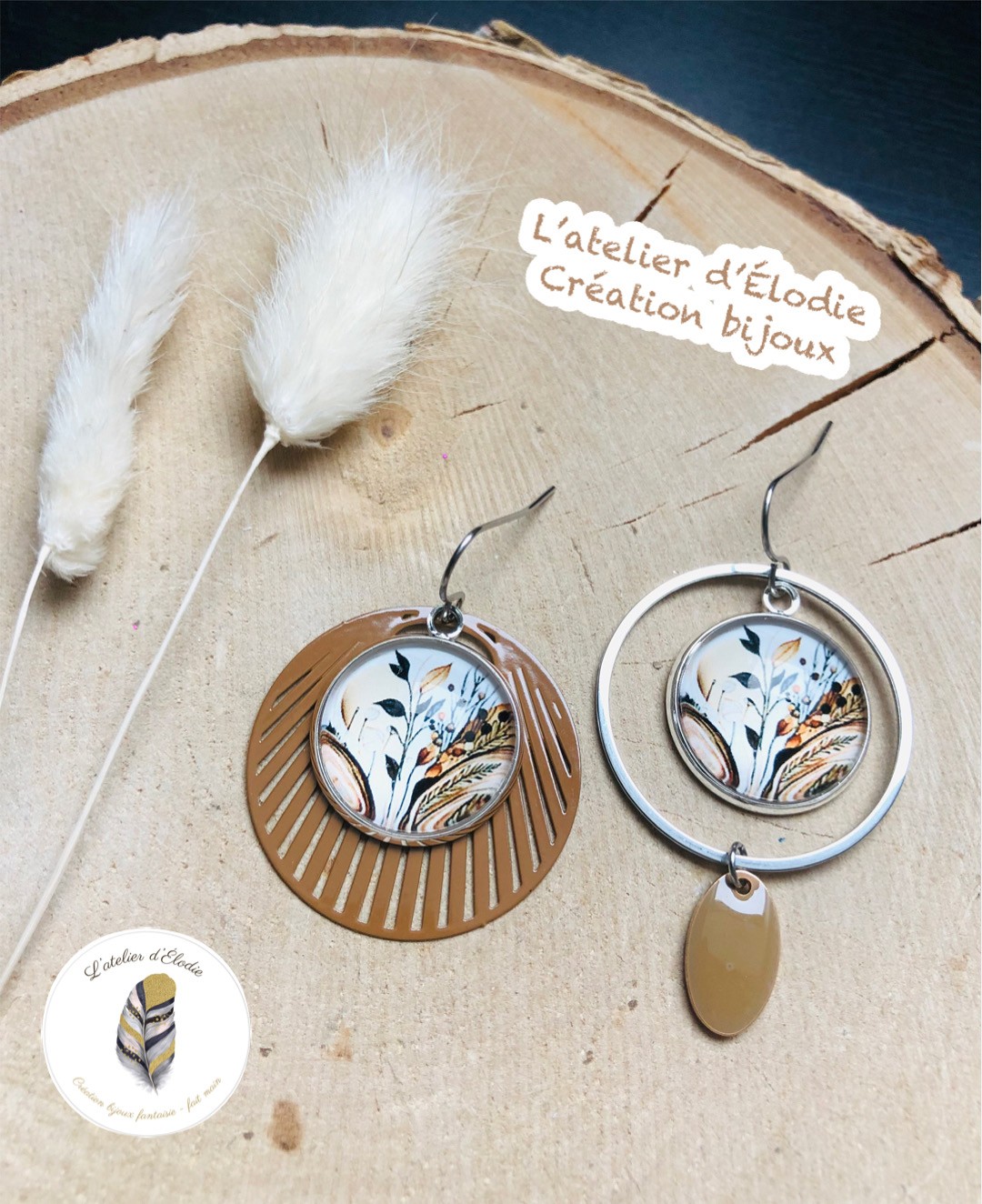 montées sur crochet d'oreille acier, illustrations sous verre 18mm, anneau fermé 35mm, breloques colorées et émaillées